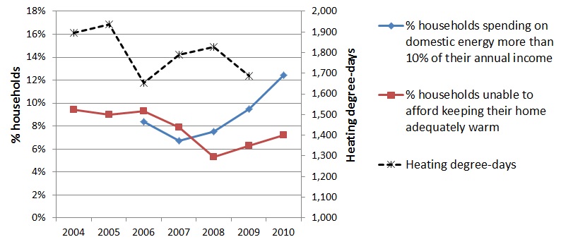 In Spain, some early attempts to measure the incidence of energy poverty were produced in the framework of the European fuel Poverty and Energy Efficiency (EPEE) project. However, it was not until last year when the first proper assessment of the extent and characteristics of energy poverty was undertaken. The Asociación de Ciencias Ambientales (Environmental Sciences Association) presented in March 2012 a study that estimated energy poverty rates following the expenditure-based and consensual or self-reported measuring approaches. The results, calculated on data from the Spanish Household Budget Survey (HBS) and the EU Survey on Income and Living Conditions (EU SILC), indicate that approximately 10% of Spanish households (equivalent to 4 million people) were in energy poverty as of 2010. The evolution of both indicators shows a sustained increase in energy poverty rates since the onset of the global financial crisis (2007-2008). Note that the recorded change in energy poverty rates seems to be unrelated to the severity of the winter as measured by the number of annual heating degree-days.