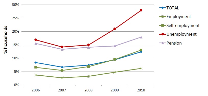 Expenditure-based energy poverty rates in Spain 2004-2010, disaggregated by main income source of the household (% households in energy poverty). Source: Tirado Herrero et al. (2012)